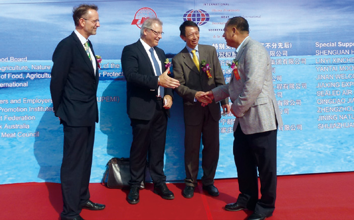 2013年10月13日,第十一屆中國(青島)國際肉類工業(yè)展覽會上,大莊園集團(tuán)董事長陳希濱與世界肉類組織主席阿圖羅·拉瓦洛友好交談。
