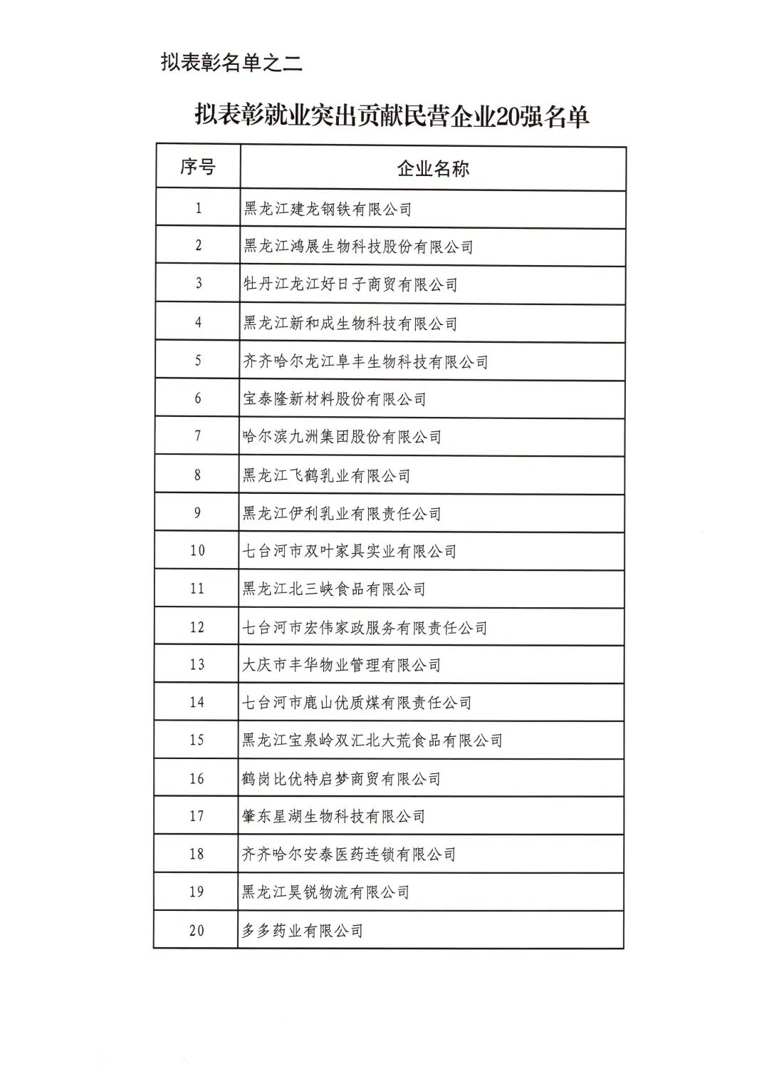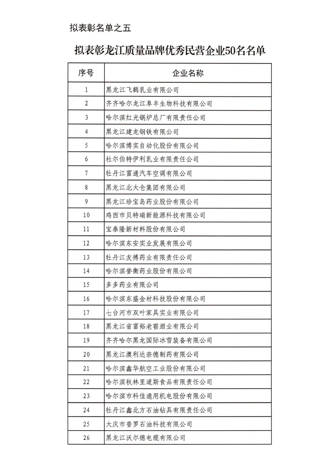 按照省委省政府關于召開全省民營經濟大會的決策部署要求,擬對全省優秀民營企業進行表彰。經企業自愿申報、市(地)把關推薦,評審小組排名,征求相關部門意見等程序,擬表彰全省累計納稅民營企業50戶、就業突出貢獻民營企業20戶、民營高新技術企業50戶、外向型經濟貢獻民營企業30戶、龍江質量品牌優秀民營企業50戶、生物經濟民營企業20戶和數字經濟民營企業20戶。現將擬表彰名單予以公示。